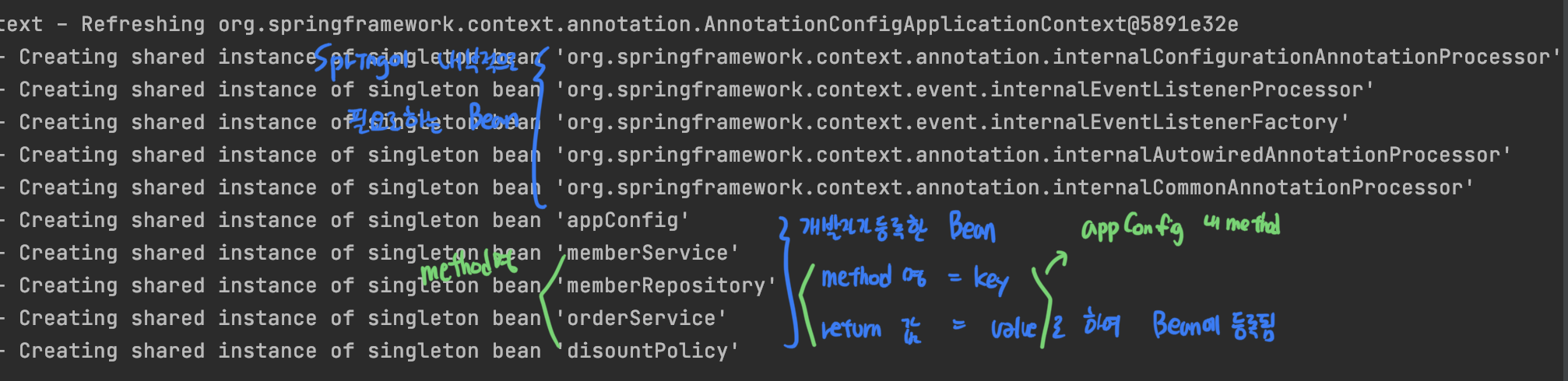 이렇게 되면, @Bean이 부착된 메소드들은 스프링 컨테이너에 스프링 빈으로 등록된다.