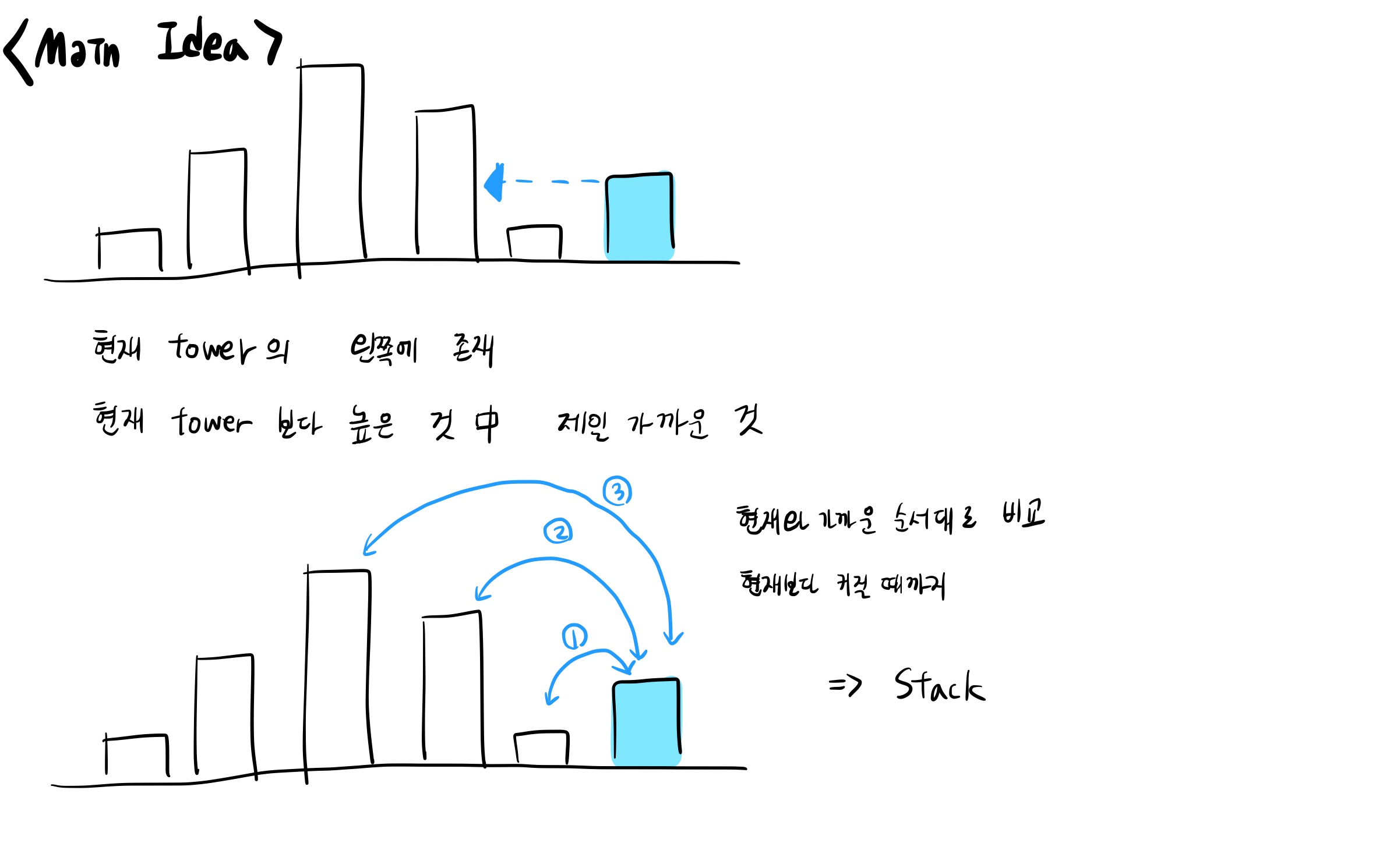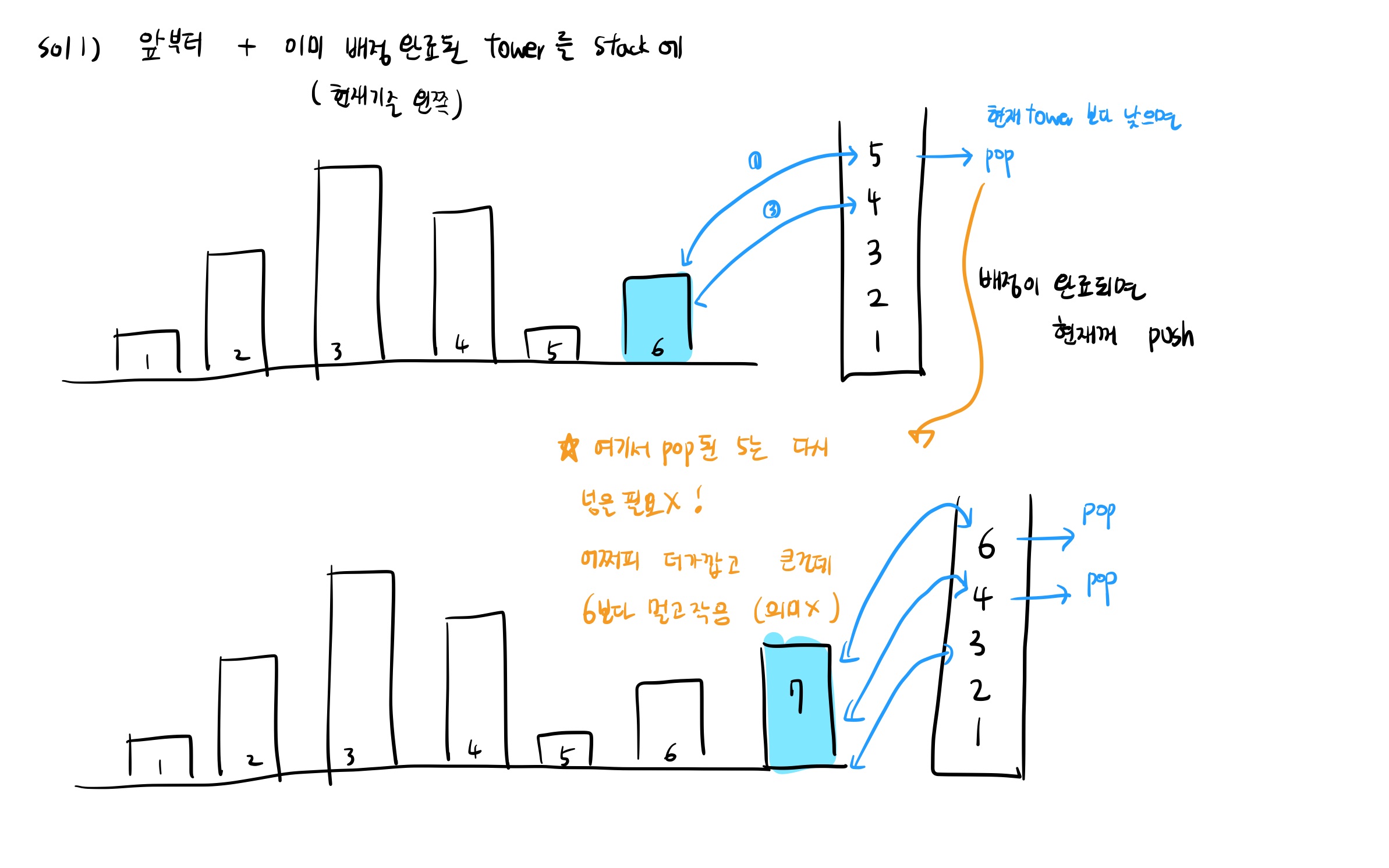 결정을 해야하는 타워와 스택을 하나씩 비교해서, 현재 타워보다 높이가 낮으면 pop해간다.