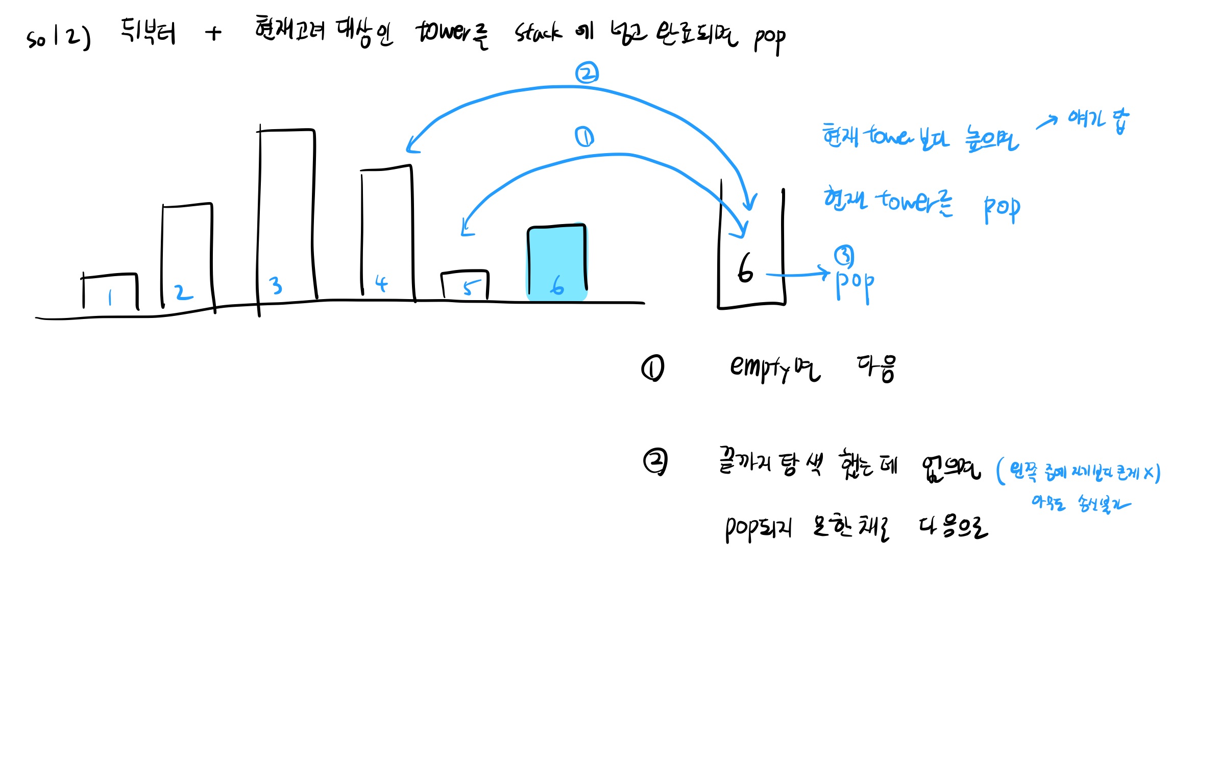 * 1. (1 ~ n) 따라서 스택의 top에 있는 인덱스의 탑 높이가 현재 탑 높이와 같거나 낮다면 pop