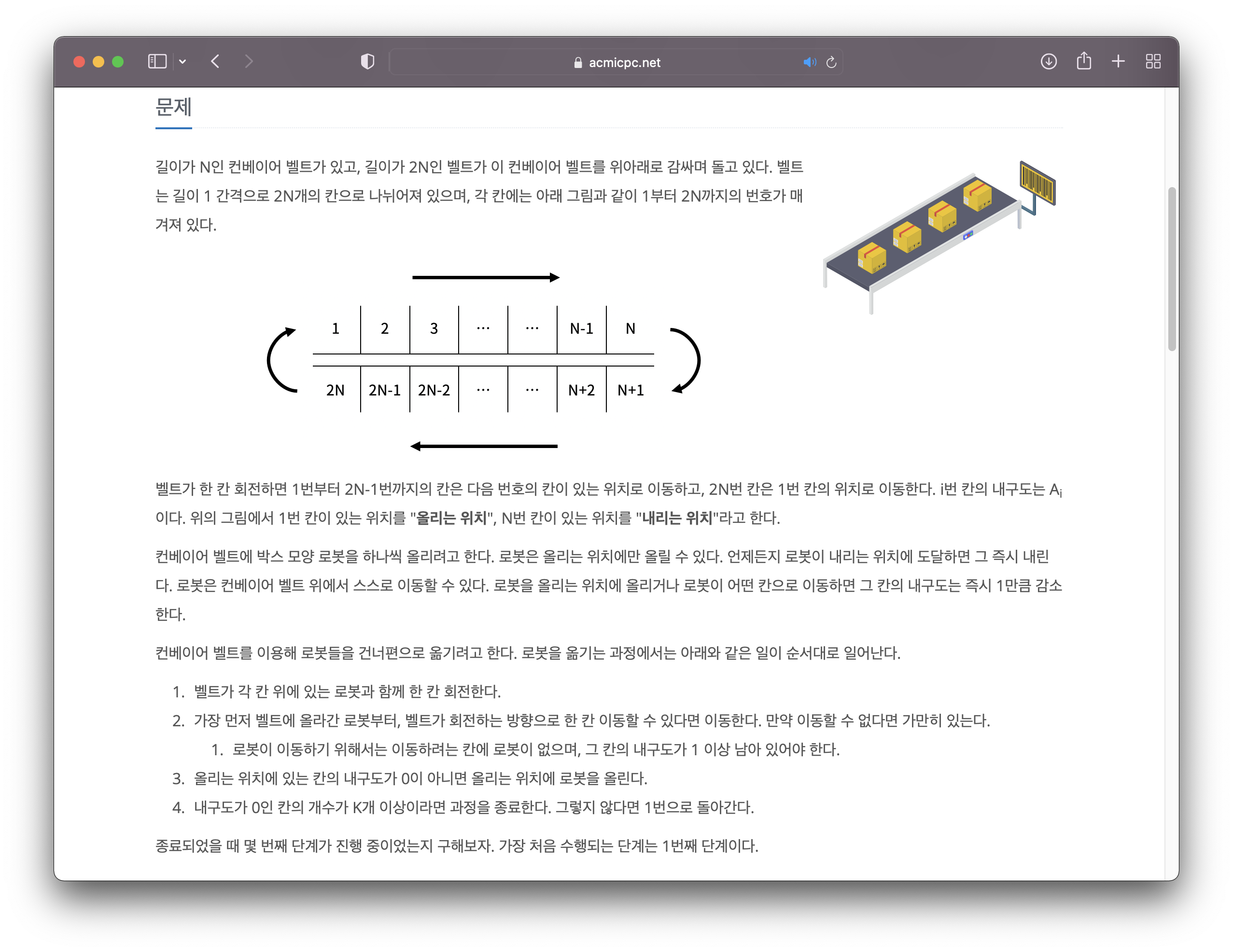 * 내구도 감소 (-1) : 1. 올리는 위치에 로봇을 올림 2. 로봇이 이동해서 해당 칸에 올라옴