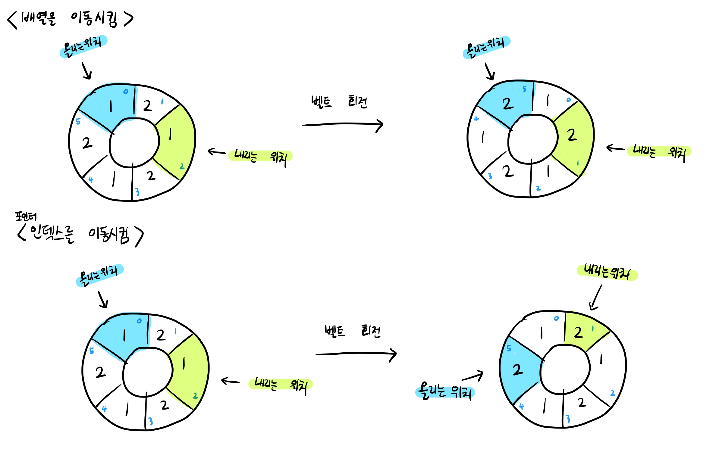 (이때 회전벨트이므로, 원형 큐처럼 구현해야한다. 하지만 원형 큐는 pos++였던 점에서 코드가 약간 다름)