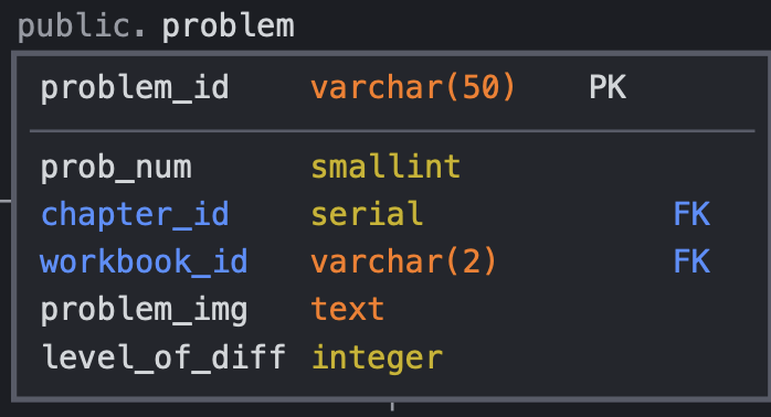 - chapter_id : 2자리 캐릭터로 고정되었음 (이거 우리끼리 고정한거라 아마 협의?필요 자리수맞아야 problem_id됨)