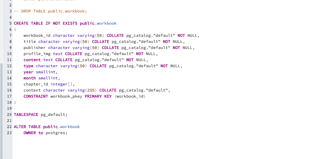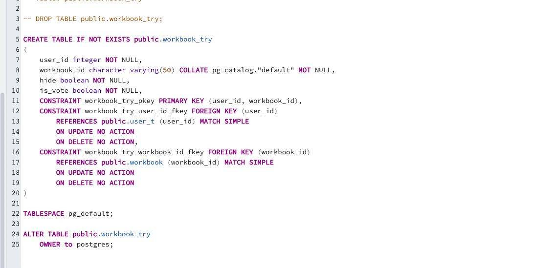 test_workbook이라는 테이블이 존재함 (무슨용도? 삭제?)