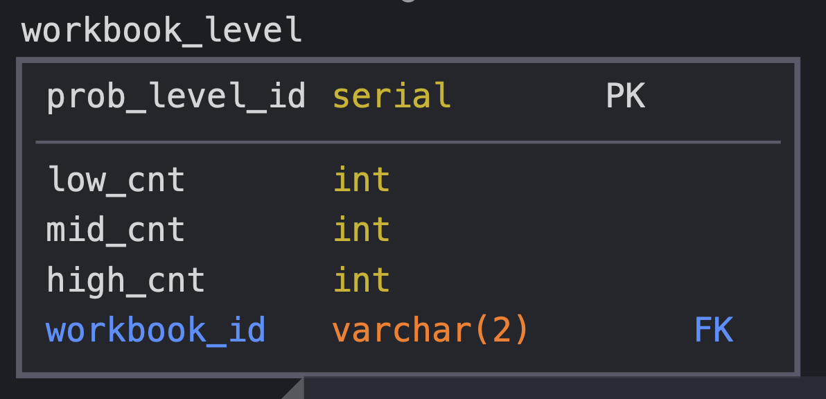 | workbook_level | 문제집 난이도 투표수를 저장하는 테이블 |