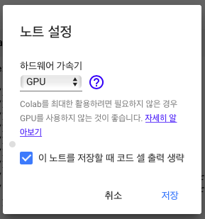 런타임 -> 런타임 유형 변경 -> 하드웨어 가속기 : GPU